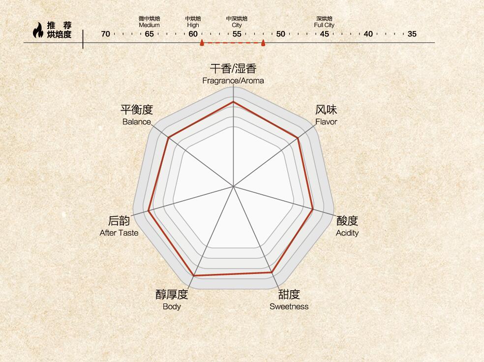 柑橘(Citrus) 巧克力(Chocolate) 坚果(Nut) 焦糖(Caramel) 烘焙度:High~City 59~52 |